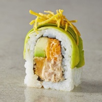 Tuna mayo, tempura sweet potato, avocado, wrapped in avocado, topped with crispy sweet potato