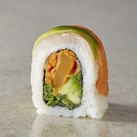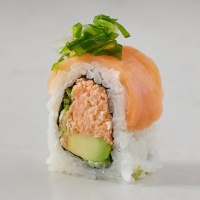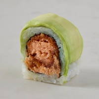 Spicy raw salmon, green onion, tamago, avocado, wrapped in seared salmon, drizzled with spicy mayo