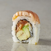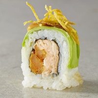 Baked salmon, tempura sweet potato, wrapped in avocado, topped with crispy sweet potato and teriyaki sauce