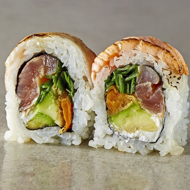 טונה אדומה, אבוקדו, בצל ירוק, גבינת שמנת, בטטה, במעטפת דניס צרוב ובצל ירוק מעל