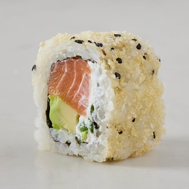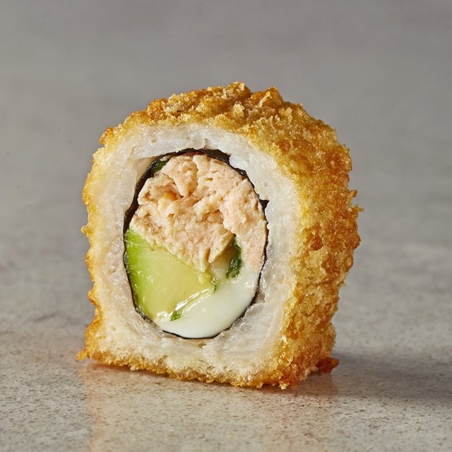 סלמון נא, אבוקדו, גבינת שמנת, בצל ירוק במעטפת פנקו ושומשום
