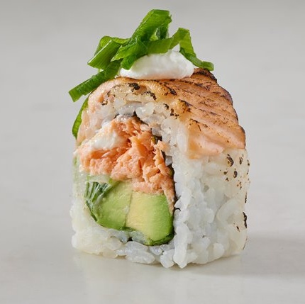 סלמון אפוי, אבוקדו, גבינת שמנת, בצל ירוק, במעטפת סלמון צרוב ובצל ירוק מעל