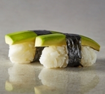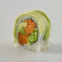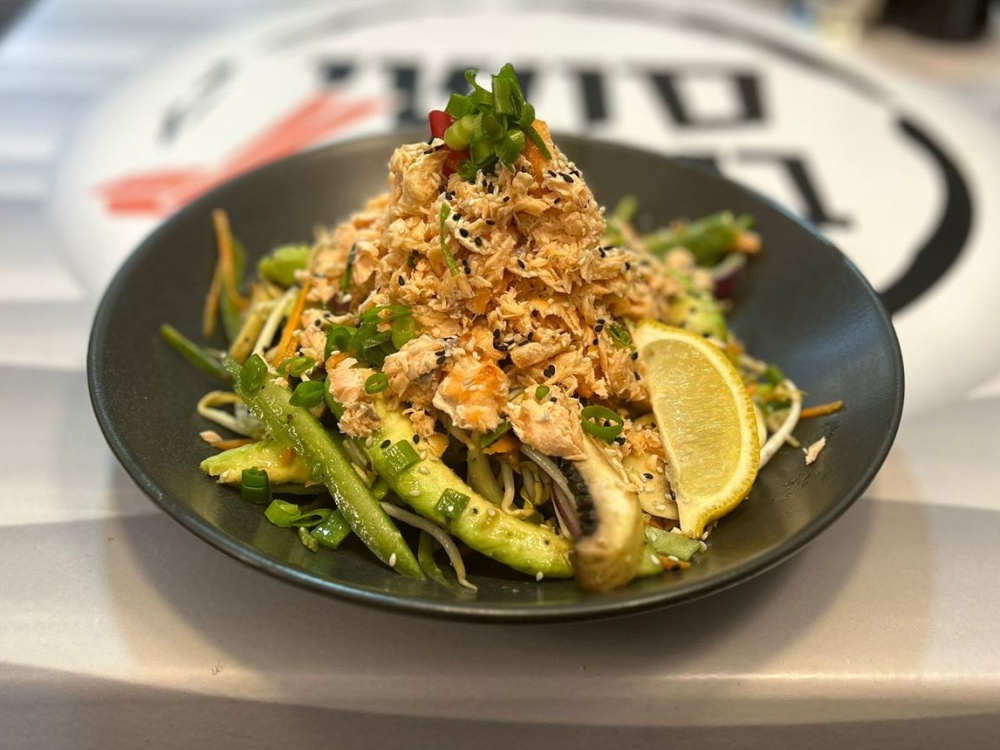 מלפפון, בצל סגול, בצל ירוק, גזר, אבוקדו, נבטים, סלמון אפוי מעל בווינגיט שמן שומשום