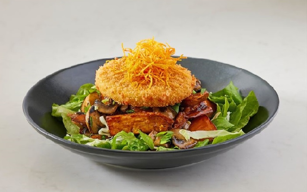 חסה, כרוב, בטטות ופטריות מטוגנות מתובל בצ'ילי מתוק ביתי אם עיגול מוצרלה בציפוי טמפורה ופנקו מעל